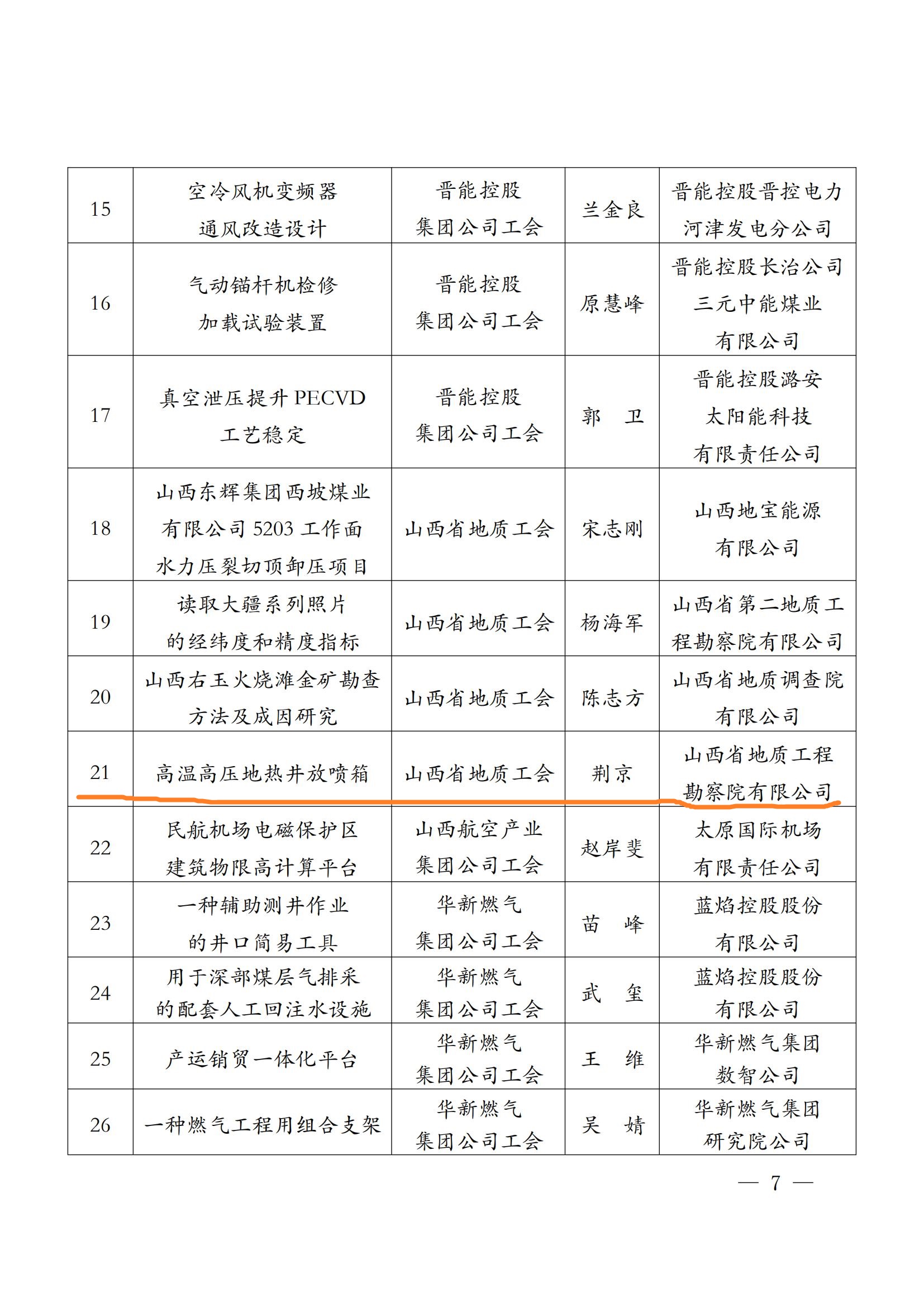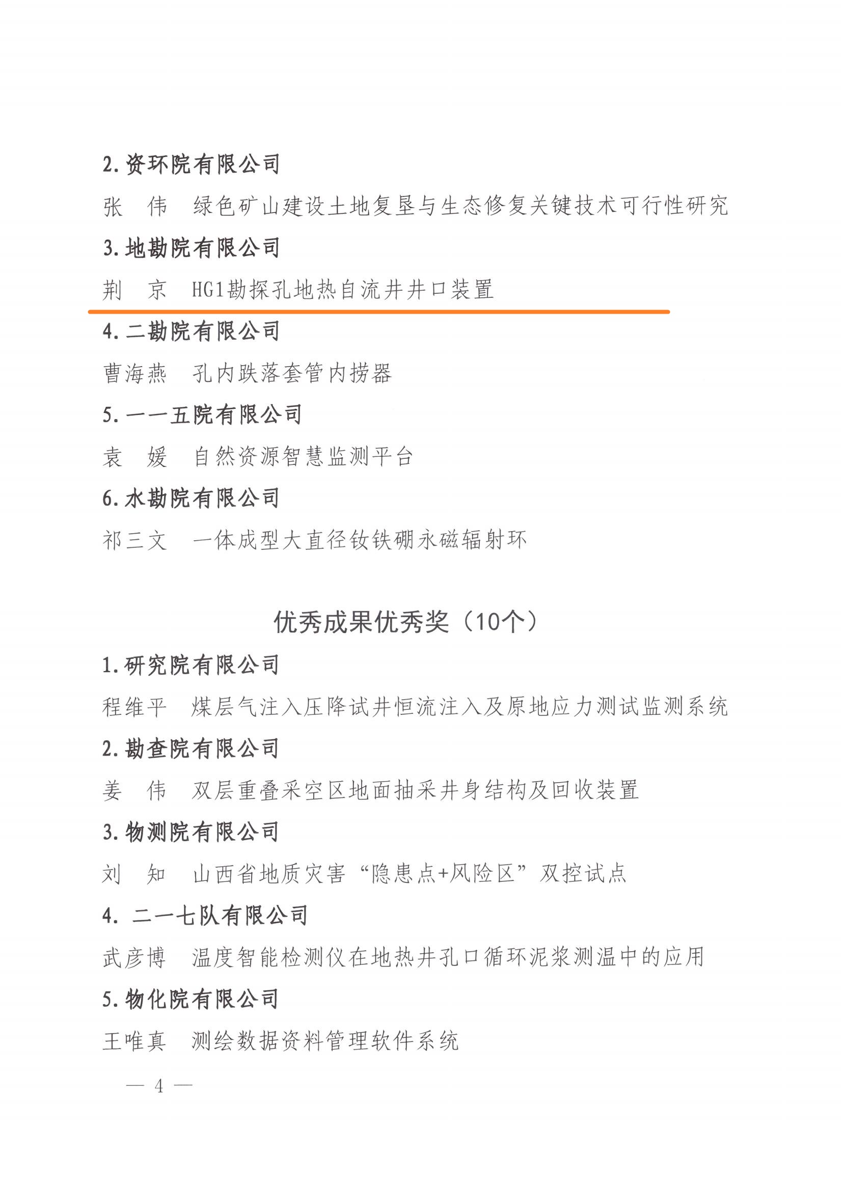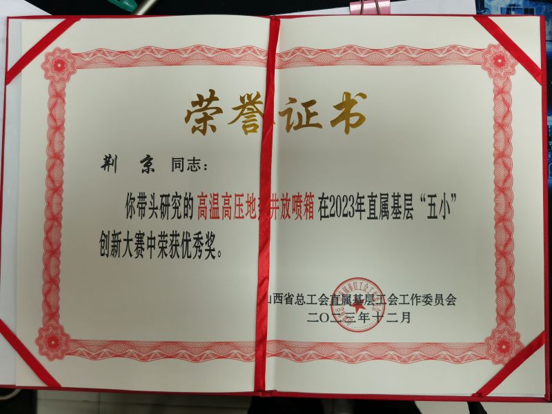 2023年,我公司荆京同志带头研究的“高温高压地热井放喷箱”和“HG1勘探孔地热自流井井口装置”分别荣获省总直属基层工委“五小”创新大赛中荣获优秀奖和地质集团“五小”竞赛优秀成果三等奖,我公司同时荣获地质集团“五小”竞赛优秀组织奖。