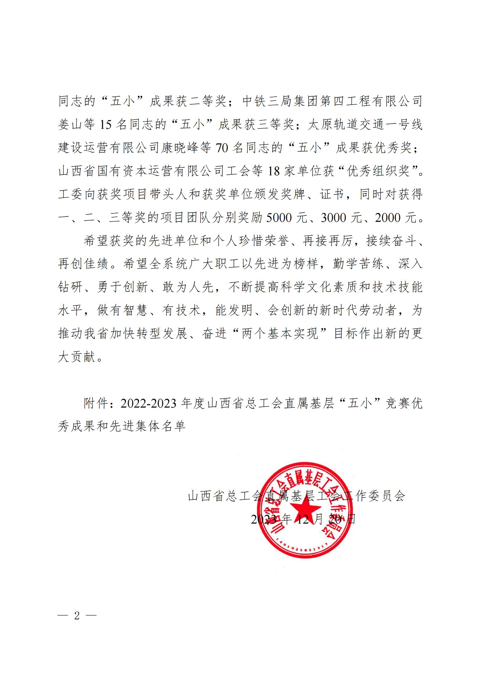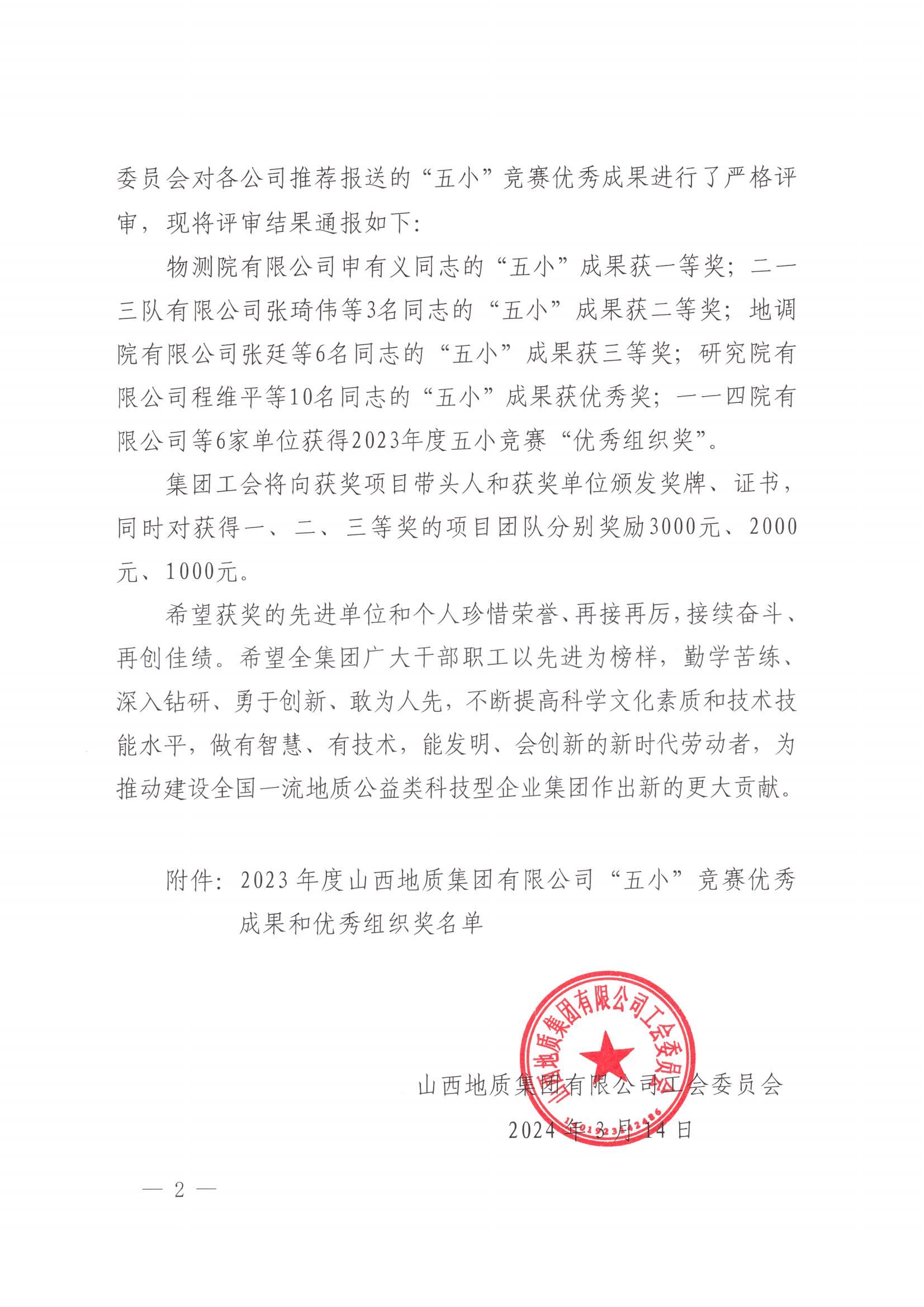 2023年,公司按照集团“五小”竞赛工作安排,为激发公司广大干部职工的劳动热情和创新活力,充分调动广大干部职工的积极性、主动性、创造性,加快建设一流公益地质科技企业,认真开展“五小”竞赛活动,集聚全员智慧,深挖职工创新创效潜能,将“五小”竞赛作为提高职工技能、推动技术进步、提升工作效能、实现节能降耗的重要途径。同时,促使广大职工主动学习新技术、掌握新技能、练就真本领,努力成为行业技术骨干,以劳动和技术成果书写出彩人生,为公司高质量发展积蓄力量!