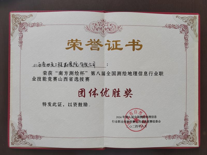 近日,由省自然资源厅、省人力资源和社会保障厅、省总工会联合举办的 2024 年“南方测绘杯”第八届全国测绘地理信息行业职业技能竞赛山西省选拔赛在晋中职业技术学院落幕。地勘院有限公司荣获团体优胜奖,两名职工获得个人三等奖。
