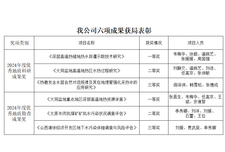 近日,2024年度局优秀地质勘查成果奖与优秀科研成果奖评选结果揭晓,我公司六项成果获局表彰。
